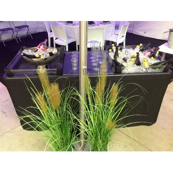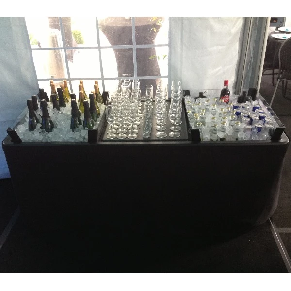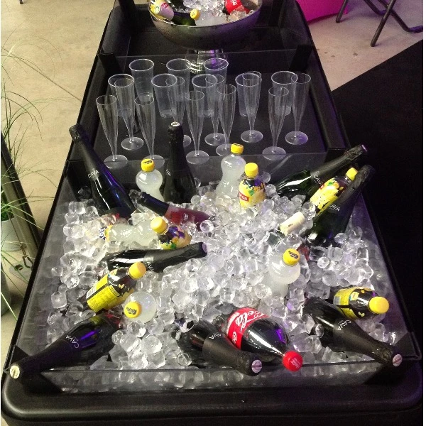 Als alternatief voor een koelkast kan je deze ijstafel met rok plaatsen, 2 plexiglas bakken gevuld met ijsblokken(zelf te voorzien of aan te maken met onz ijsblokjes machine) en een middentafeltjes voor glazen. Zo kan je de drank koel houden door hem tussen de ijsblokkken te plaatsen.