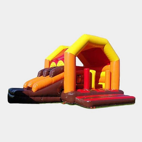 Overdekt springkasteel met dubbele grote glijbaan.